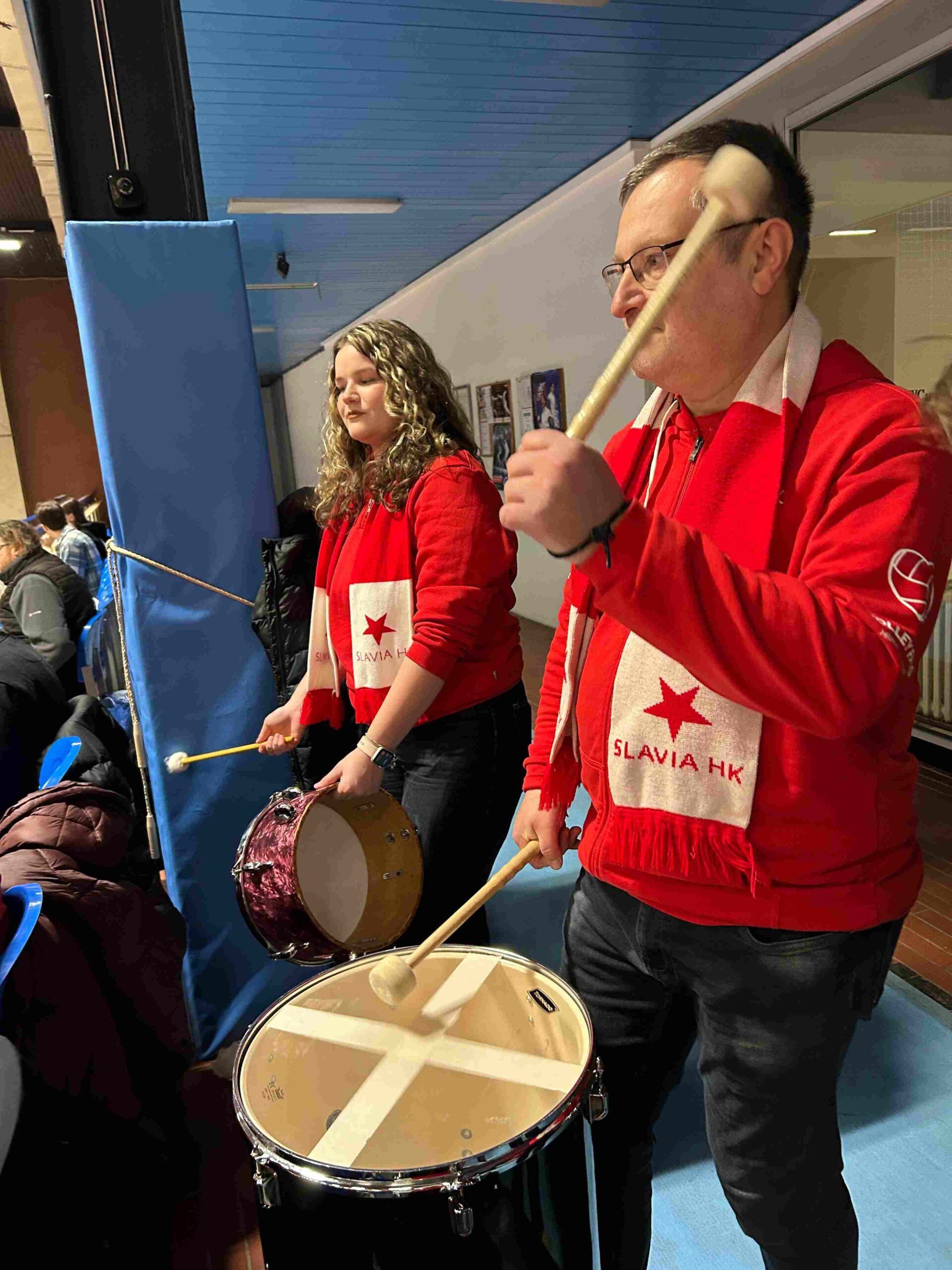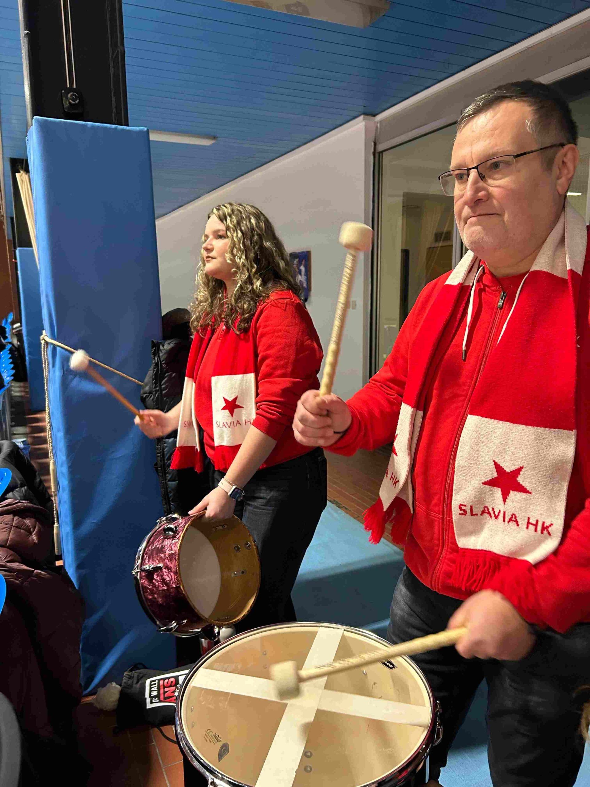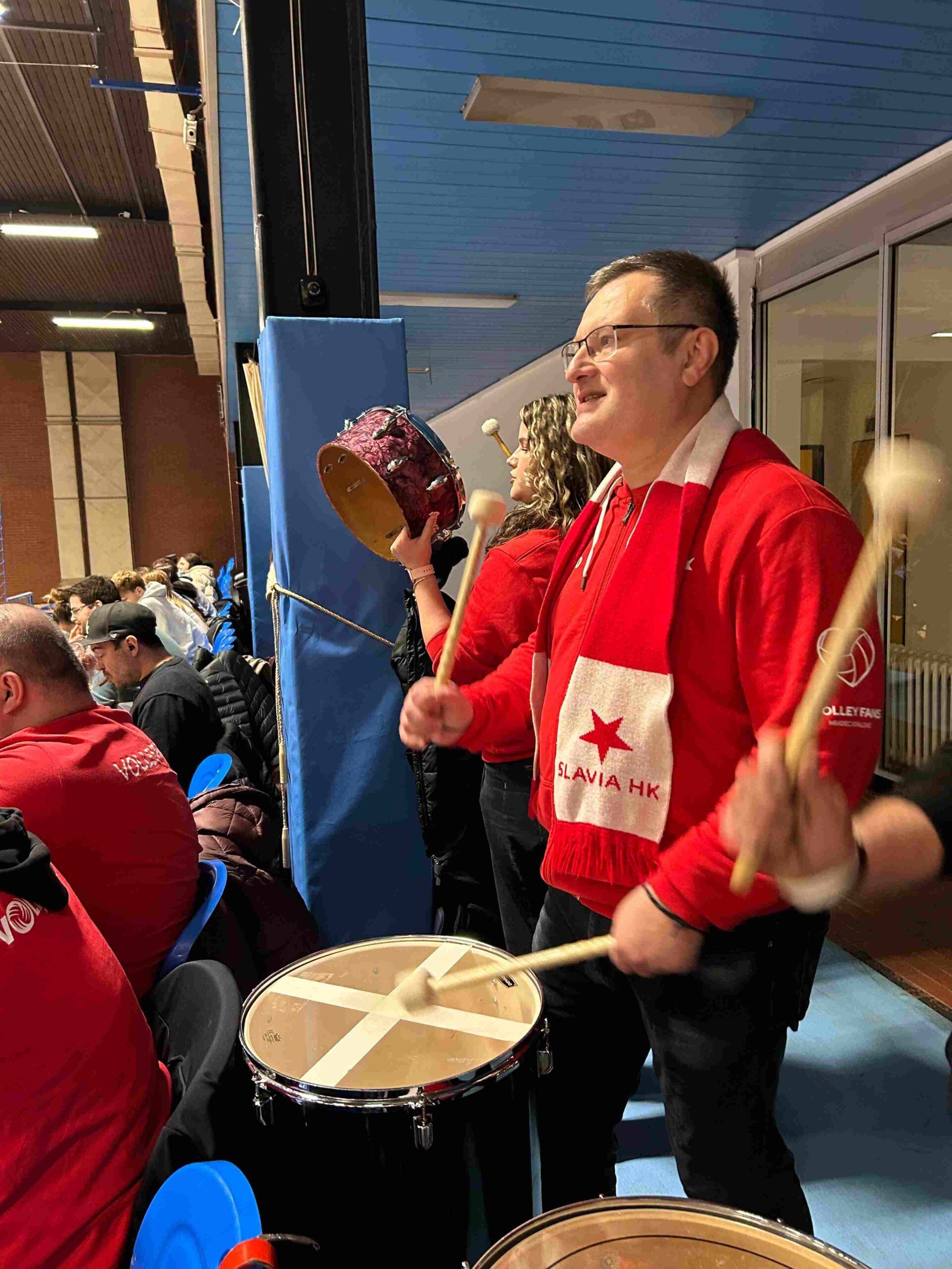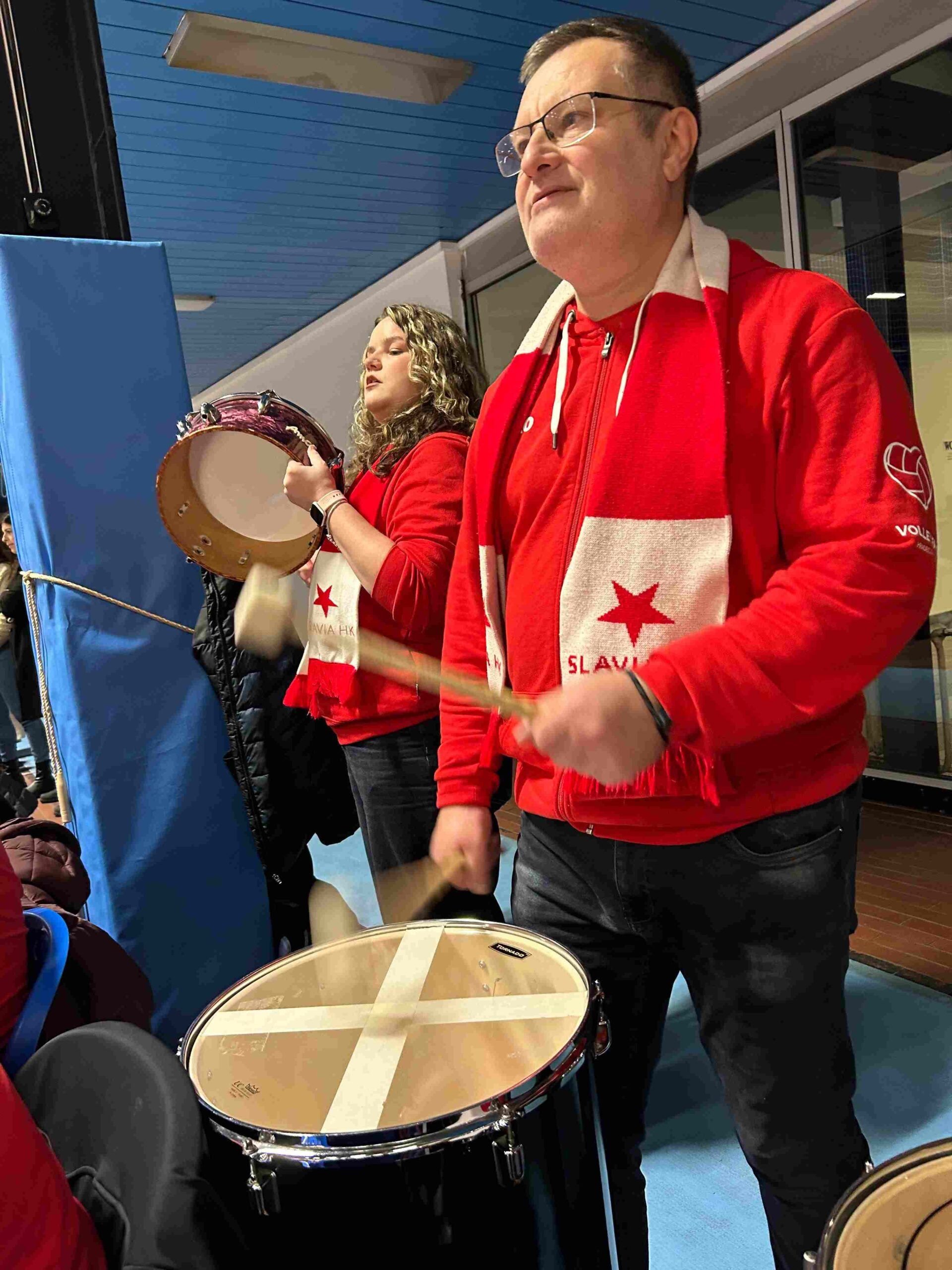 A teď k hale… Řekněme, že prostoru pro fanoušky tam není zrovna na rozdávání. Ale kdo umí, ten umí – Volley Fans HK si našli svá místa, rozložili bubny a byli připraveni dát o sobě vědět. A taky že dali. Hned první balón šel sice domácím, ale to nás nerozhodilo. My jsme si jeli svoje.