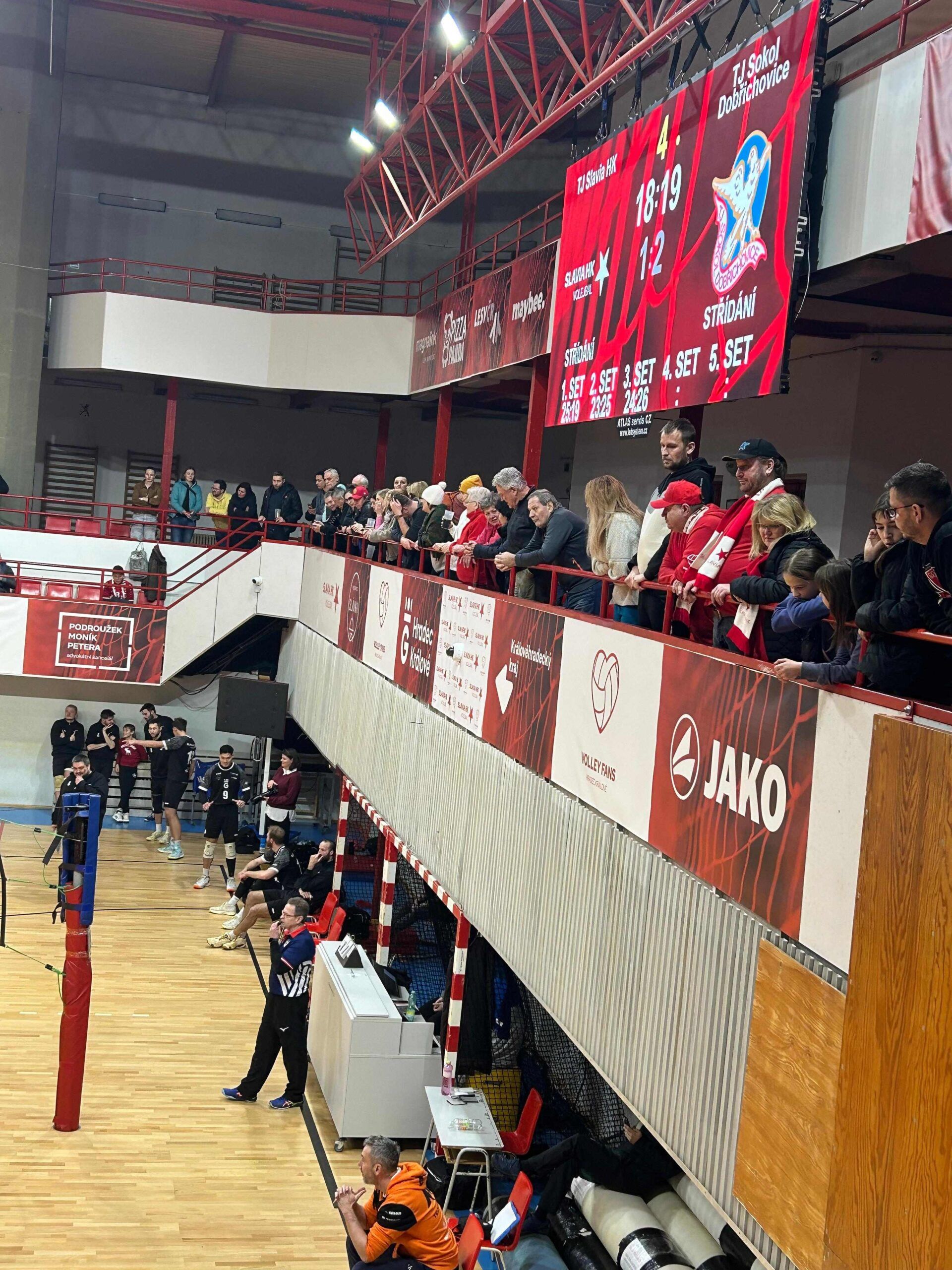 Po kratším zdržení nastoupili muži proti tradičně silným Dobříchovicím. Zápas měl všechno – napětí, emoce, sporné momenty i výborné výměny. Chyby se nevyhýbaly ani hráčům, ani rozhodčím, ale bojovalo se až do posledního míče.