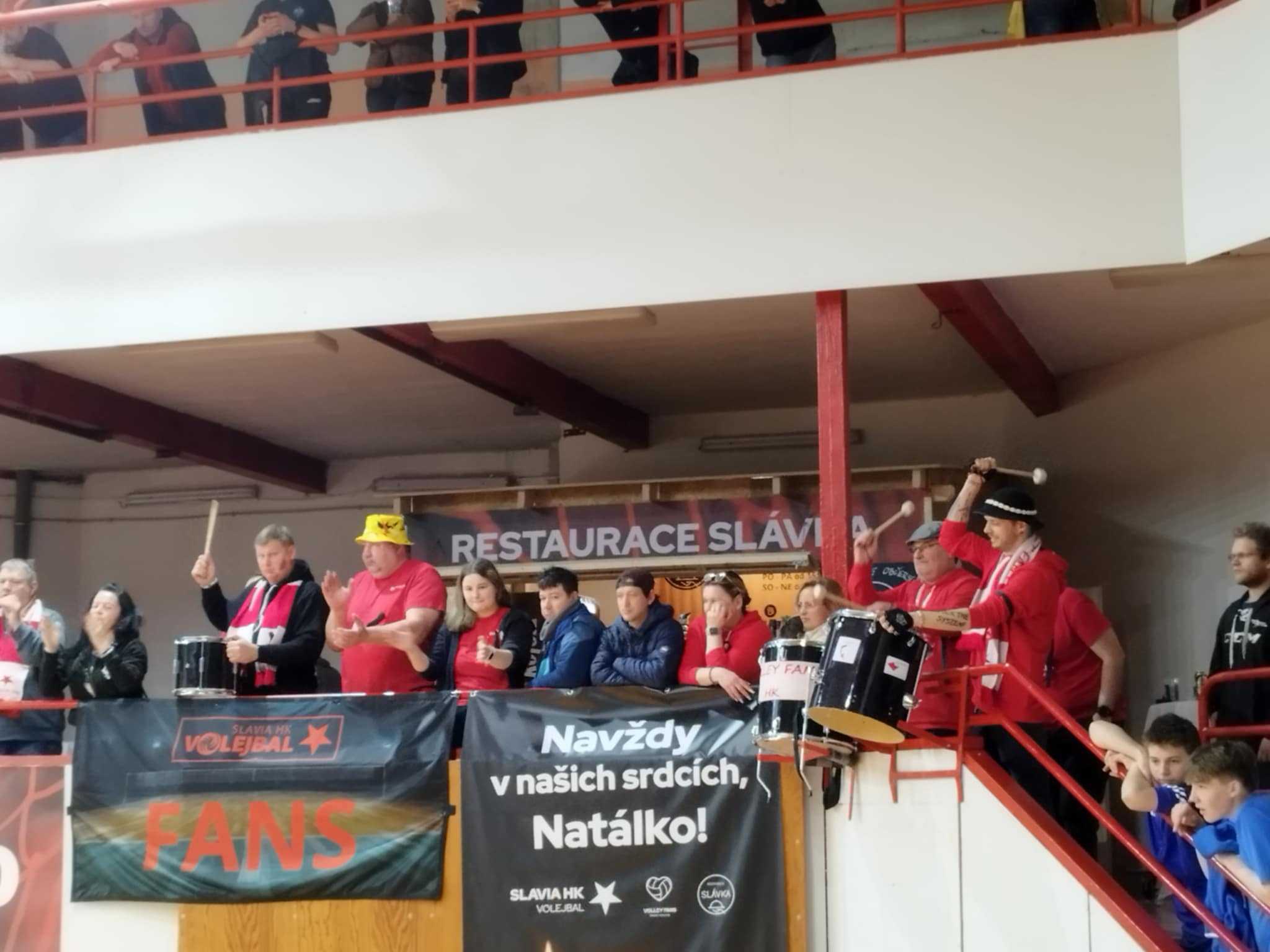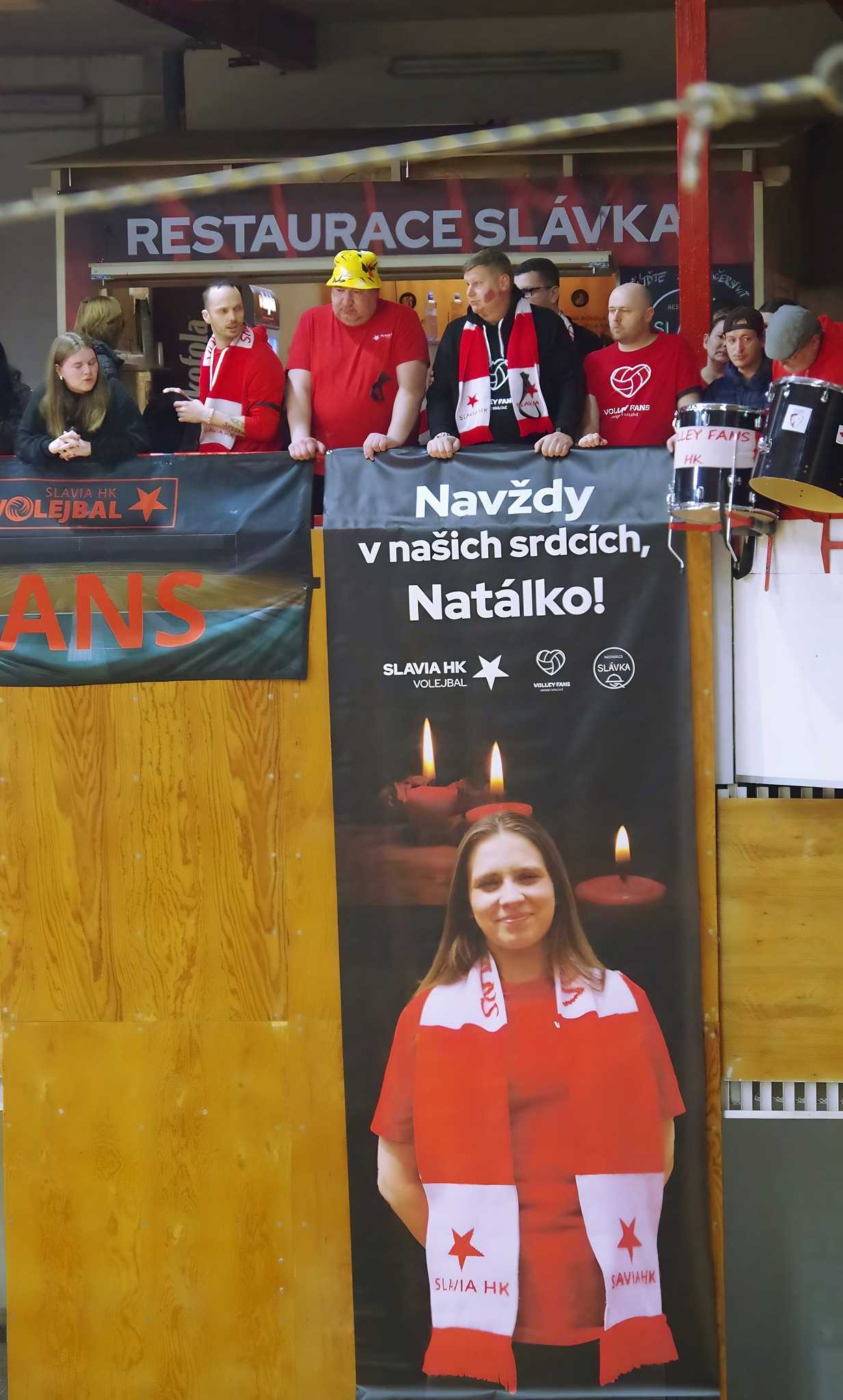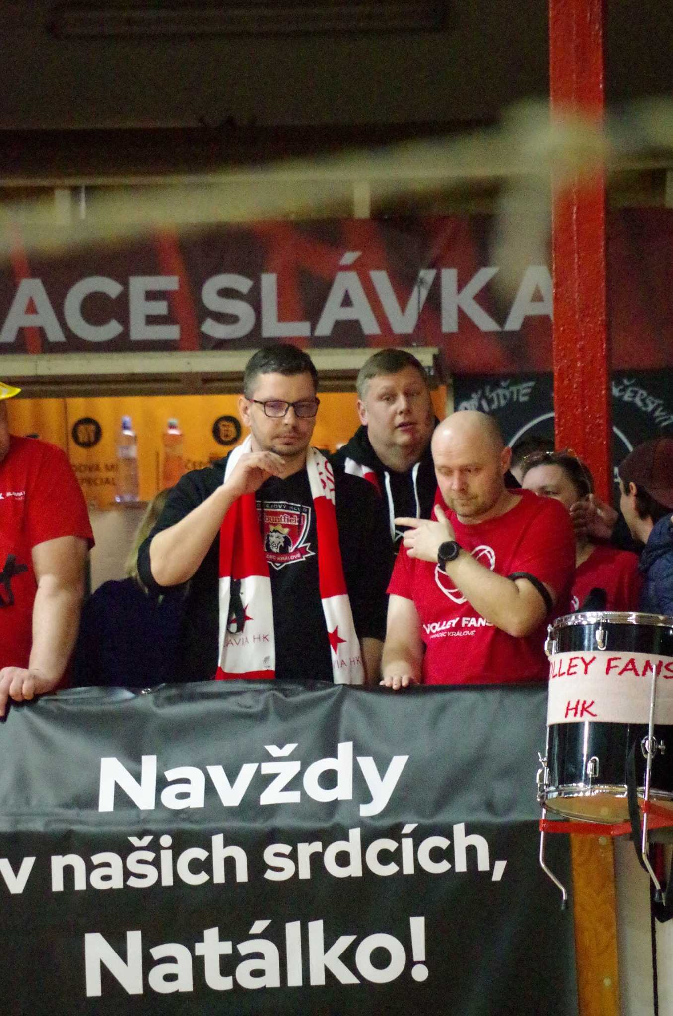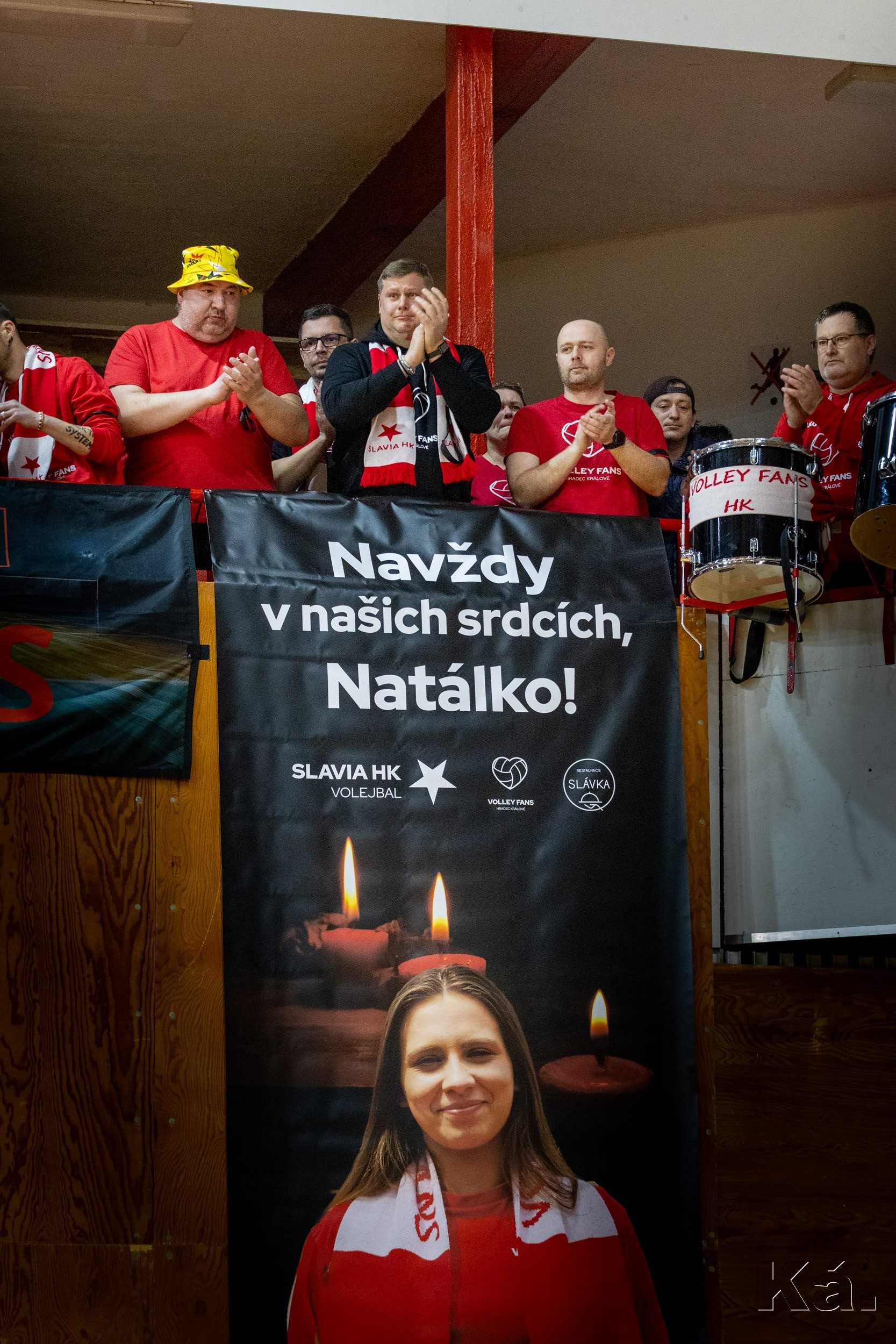 Před zápasem mužů jsme minutou ticha uctili památku naší mladé a milé Natálky, která nás na začátku týdne tragicky opustila. Natálka patřila k hradecké Slávii už od dětského věku a byla členkou vedení Volley Fans HK. Připravili jsme v hale pietní místo, kde mohli její památku uctít všichni návštěvníci obou zápasů. Na začátku minuty ticha se z prvního ochozu snesl baner a Natálka byla pomyslně opět s námi v hale a v našich srdcích.